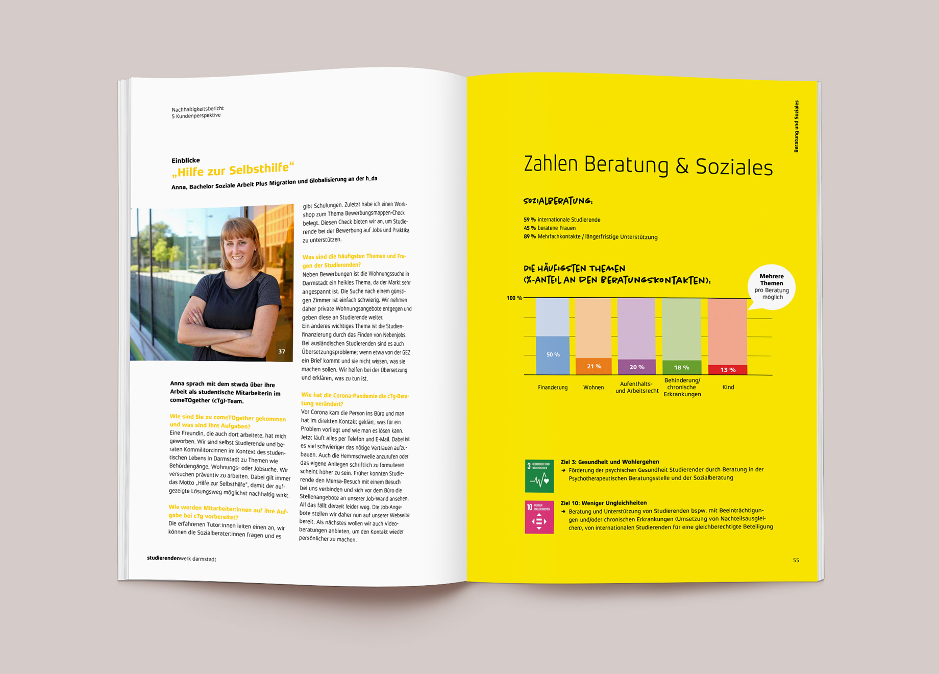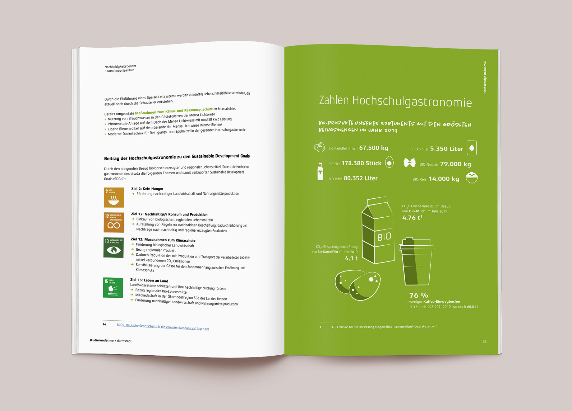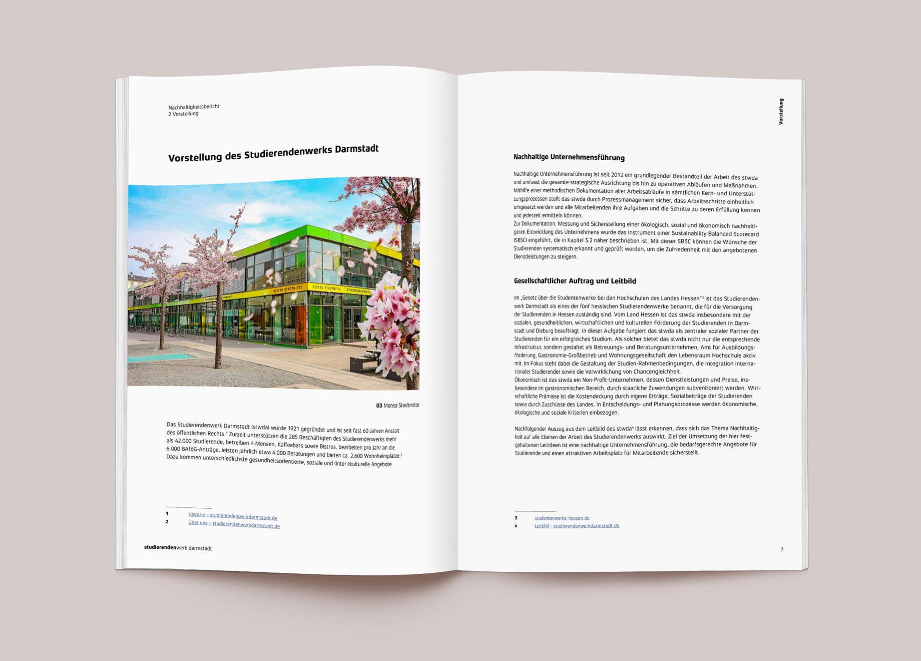 Wir freuen uns das Studierendenwerk Darmstadt bei Ihrer Mission zu unterstützen , Prozesse und Strukturen in allen Bereichen nach den Prinzipien der Nachhaltigkeit und des Gemeinwohls weiterzuentwickeln. Unser Beitrag ist die Konzeption, Aufbereitung und Gestaltung der Ergebnisse in einem alle zwei Jahre erscheinenden Nachhaltigkeitsbericht. We are pleased to be able to support the Studierendenwerk Darmstadt in its mission to further develop processes and structures in all areas according to the principles of sustainability and the common good. Our contribution is the preparation and design of the results in a sustainability report published every two years.