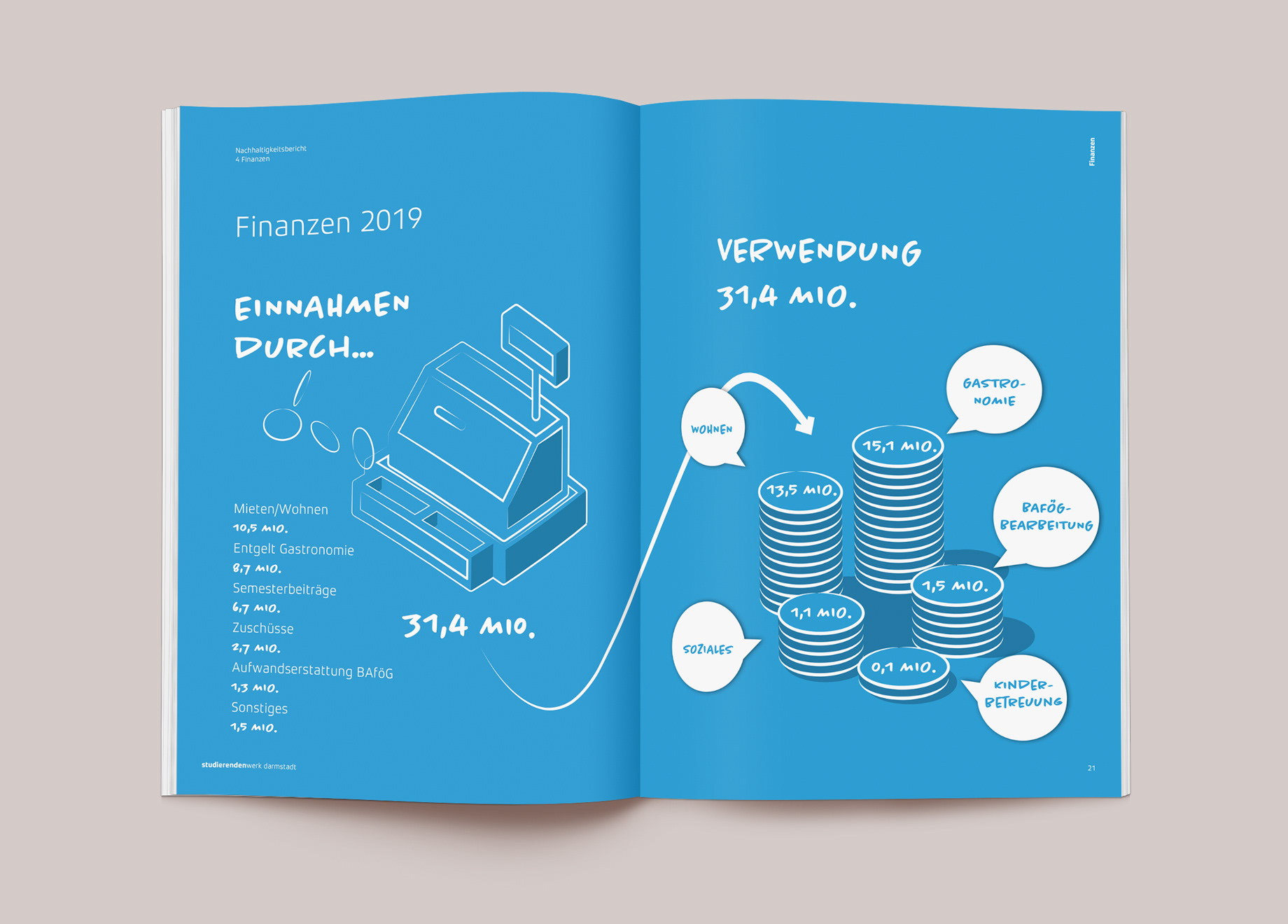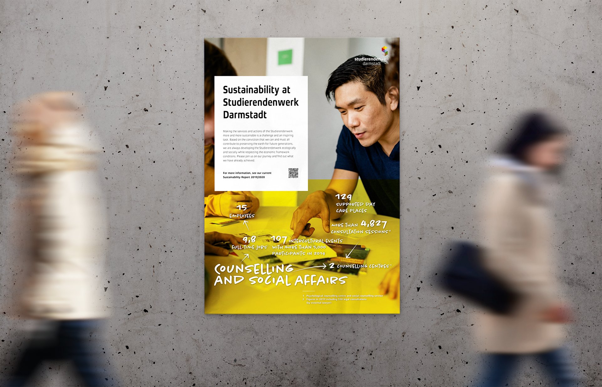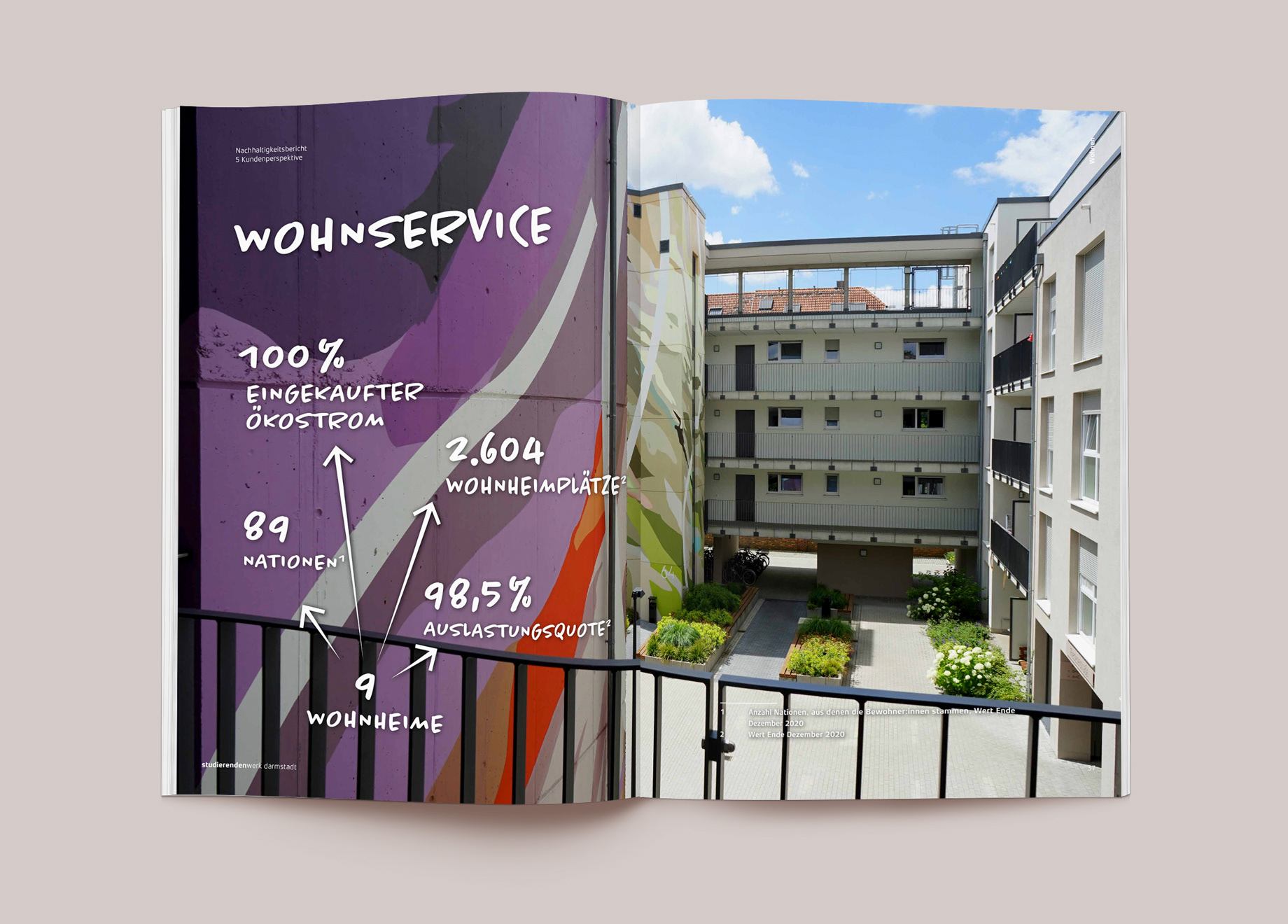 Wir freuen uns das Studierendenwerk Darmstadt bei Ihrer Mission zu unterstützen , Prozesse und Strukturen in allen Bereichen nach den Prinzipien der Nachhaltigkeit und des Gemeinwohls weiterzuentwickeln. Unser Beitrag ist die Konzeption, Aufbereitung und Gestaltung der Ergebnisse in einem alle zwei Jahre erscheinenden Nachhaltigkeitsbericht. We are pleased to be able to support the Studierendenwerk Darmstadt in its mission to further develop processes and structures in all areas according to the principles of sustainability and the common good. Our contribution is the preparation and design of the results in a sustainability report published every two years.
